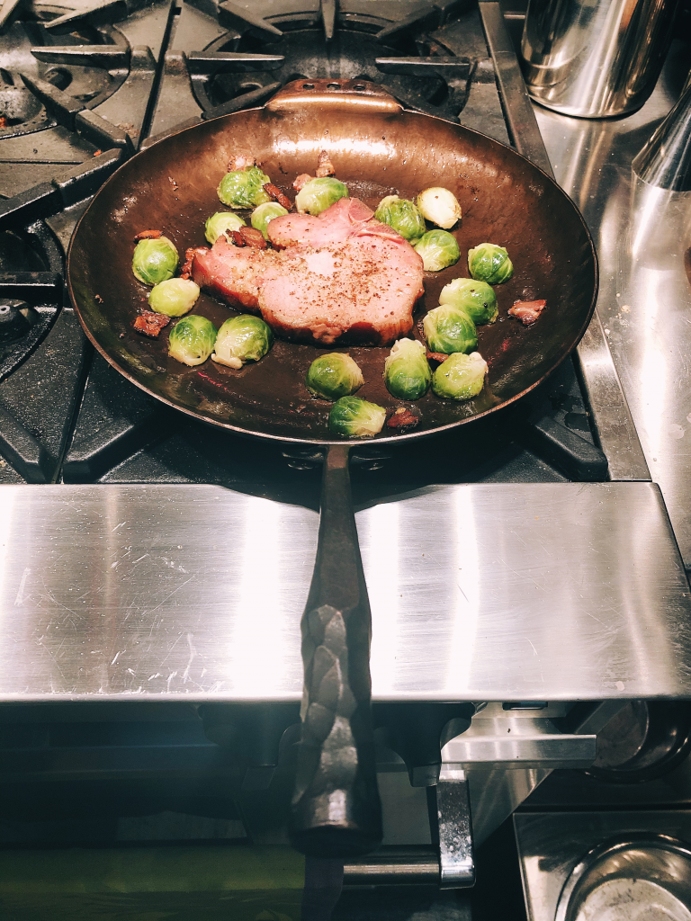 This is a hand forged–hand hammered 12″ skillet by Smithey Ironware. It is made of 2 mm carbon steel plate. That’s very thick. My 1959 Hong Kong carbon steel wok (at $12.87, the best wok money can buy) is less than 1 mm thick, so too the average crepes pan. At five pounds, this skillet is lighter than cast iron but heavier than aluminum. Smithey has designed and forged this skillet to a level of industrial art (notice the handle). On its first outing, the skillet did a good job with bacon lardons and Brussels sprouts, but that’s not much of a test (the smoked pork chop in the photo was slow cooked separately). Smithey calls it a Farmhouse Skillet. It’s beautiful, feels great in the hand, is well balanced and reeks of quality. My wok can take 22K BTU without warping, but it’s round. This steel skillet is flat, so I will start out carefully. Frankly, the farmhouse skillet is sort of a curiosity but I think it will perform well and be a valued addition to my rack of high-end performance skillets. At $275 at smithey.com.