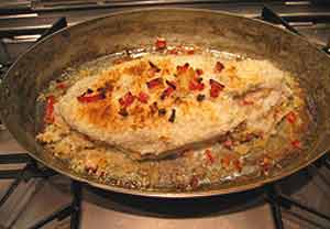 Flounder, beloved for its fine texture and delicate flavor, is one of the many popular flat fishes to be found at the market, where it is most often presented in fillets. Delicate indeed. This is not the fish of choice for cioppino or fish Veracruz, as it can’t fend off tomato sauces or robust seasonings as it falls apart in the pot. It bakes nicely hough—holding together in the process but falling apart with the slightest encouragement when done. Every night in a thousand restaurants, sheet pans of flounder, sole and halibut fillets are baked off for individual servings.