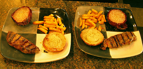 1.  Stand whole onions (skin and all) root side down in a baking pan (Teflon or covered with foil).