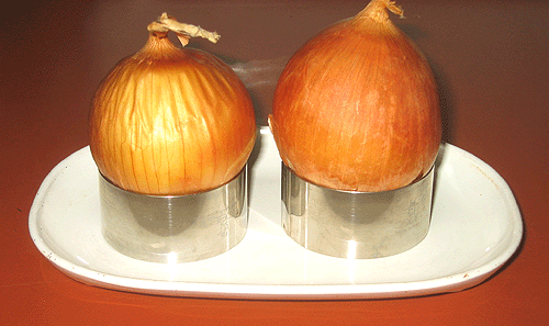 2.  If you have some ring molds, stand each the onion inside a ring mold (as shown).  If not,  trim the roots just enough so