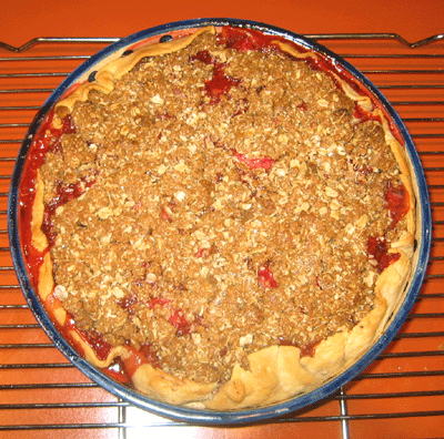 Rhubarb is a veggie that looks like celery with a sunburn. It is wonderfully tart. So please, do not drown rhubarb with so much sugar and sweet fruit that you concoct something your guests describe with a shrug (when you’re away from the table) as “Oh, it’s strawberries and ah, something else.” Two years ago, in Spring, I made a Rhubarb Strawberry Crisp. Yesterday, I had a roll of pie crust in the freezer, so I decided to make a pie with a crisp top. The weight ratio of 3:2, rhubarb to strawberries, is about right. So here we have a rhubarb pie with strawberries: