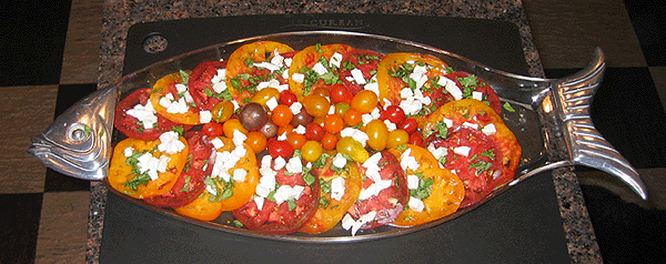 Farmers’ market, last Friday, had a nice selection of heirloom tomatoes, large and small, so here they are at Saturday’s dinner for thirteen. The big ones are sliced quite thin with a sharp serrated knife and the cherry sized
