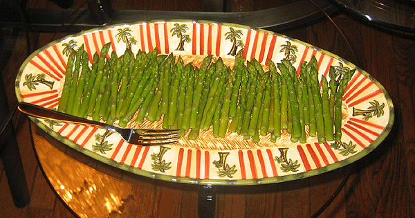 Steam the asparagus, chill in an iced water bath to hold the color, drain, dry