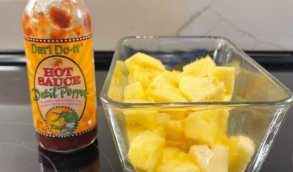 One serving left of sword fish but a lot of fresh pineapple chunks lead one to the other. Most pineapple sauces go Asian and call for teriyaki sauce, dark sugar and soy sauce. Instead, I started out with Dat’l Do-It, which is made in Florida with datil peppers. I’ve stocked it for decades. So here we have a nice Pineapple Sauce, that went great with the sword fish last night and should do as well with salmon tonight.