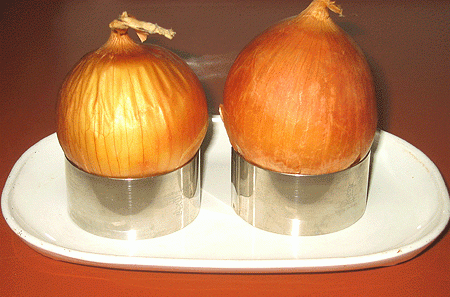 Baking whole onions is easy and can be done ahead of time. 1. Stand whole onions (skin and all) root side down in a baking pan (Teflon or covered with foil). 2. If you have some ring molds, stand each the onion inside a ring mold (as shown). If not, trim the roots …