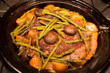 Yield: 4 servings, or 2 servings with leftovers See the article on the tagine See Abbreviations, if needed · 2 lbs roast of pork or lamb shoulder or beef chuck · 1 T EVOO · 15 oz chicken stock or canned chicken or beef broth · 1 large onion, sliced medium thick · 2 carrots, …