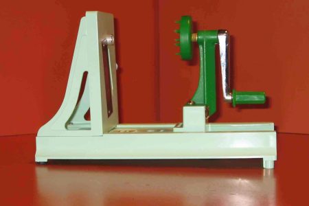 The turning vegetable slicer can be described as a “rotating mandoline.” It is a tool that looks like a lathe. On the fixed end is a short holding shaft and one fixed knife blade and one toothed blade. On the moveable end, which rides on a track, is a crank that turns another short holding …