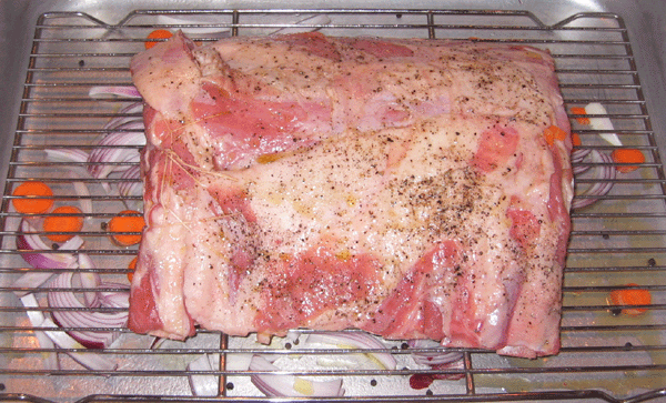 Here’s a seasoned 7 pound, seven bone veal hotel rack (I completely forgot to french the bones—dah), about to be placed in a 375F oven.