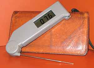 The only thermometer I use and recommend is the Thermapen.  It’s hand held, digital, fast reading and certified accurate from 50º to 572ºF. It features a “thermister” at the very tip of its needle thin probe.  It’s British made.  They have a Web site in Utah:  www.thermoworks.com. Bad news:  the Thermapen costs about $80. It’s worth it.